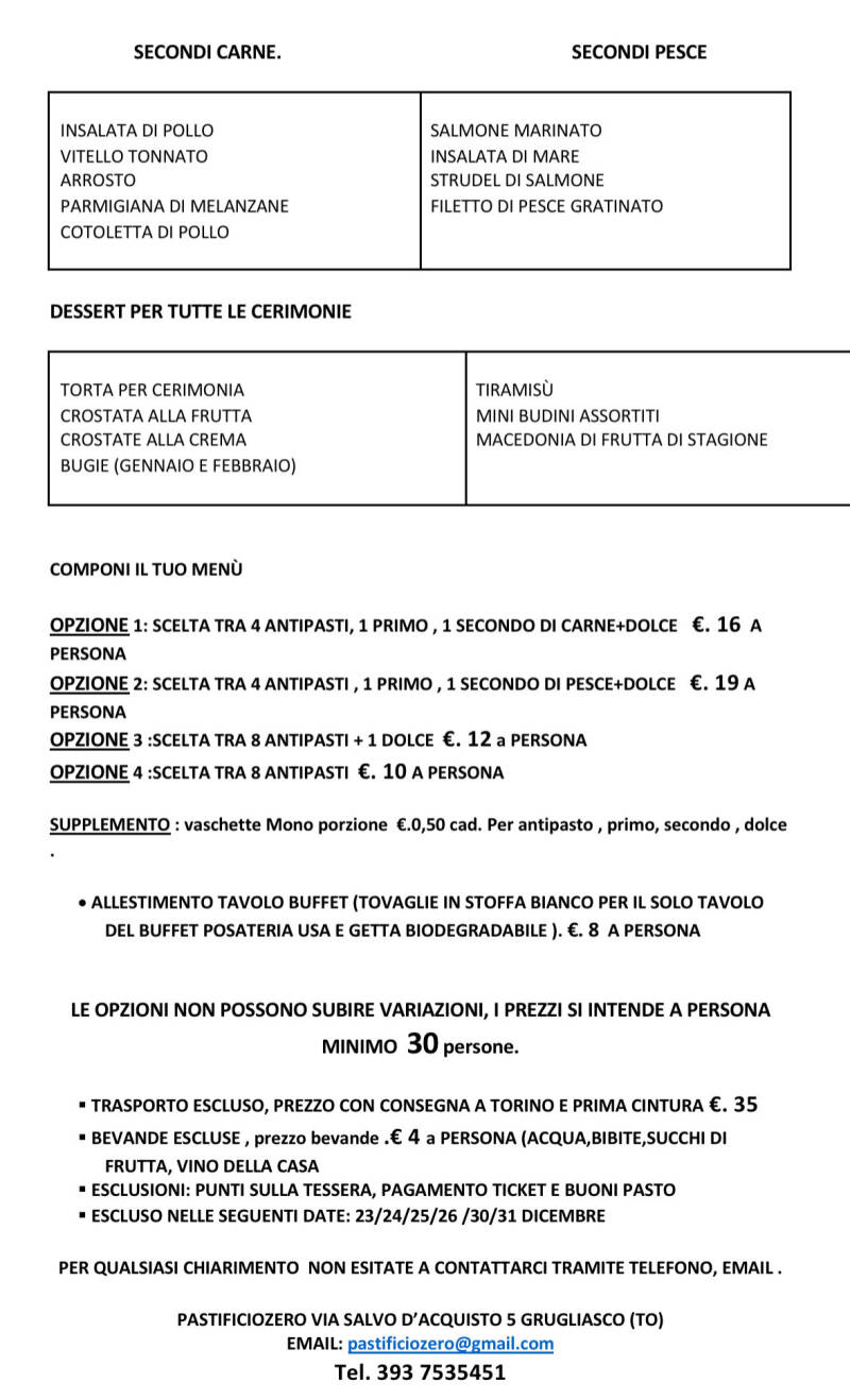 Ecco il nostro menù una serie di piatti che puoi selezionare per creare il tuo menu per APERICENA, COMPLEANNI, BATTESIMI COMUNIONI,MATRIMONI, ECC… sia privati che aziendali per info contattateci.